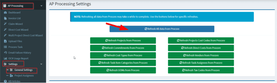 Navigate to “Settings -> General Settings” and press “Refresh all data from Procore”. This allows a OneCore to retrieve the initial information.