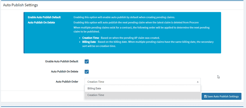 - Auto Publish On Delete – Enabling this option will auto publish the next pending claim when the latest claim is deleted from Procore