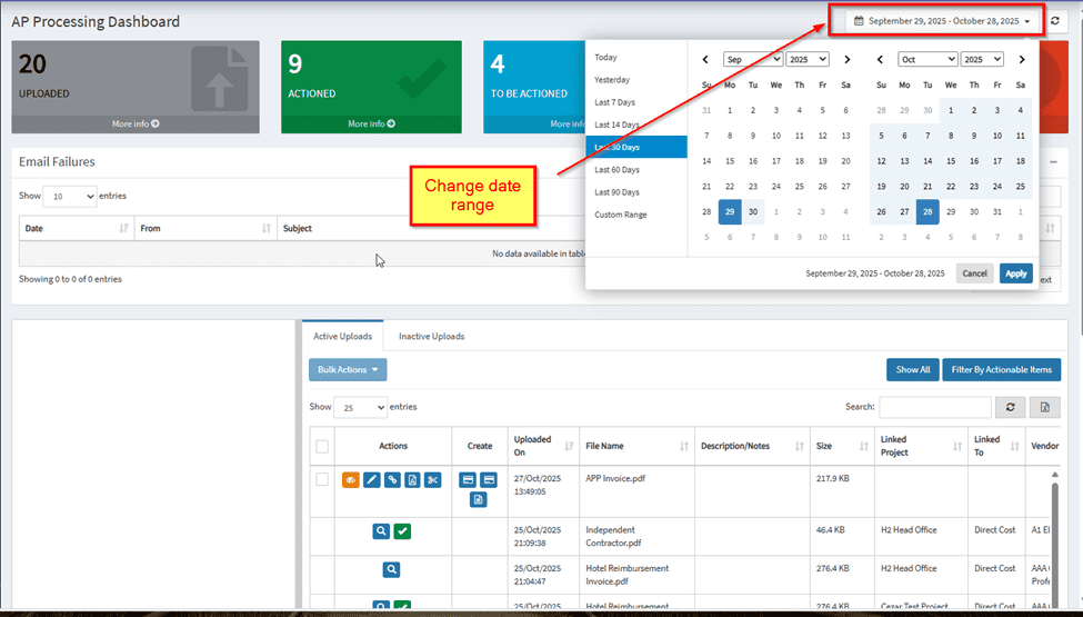 Top Banner – The APP Dashboard, by default, will show items from the last 30 days. This can be customised to display a specific date range. The coloured banners indicate invoices that fall into thresholds configured in the settings above.