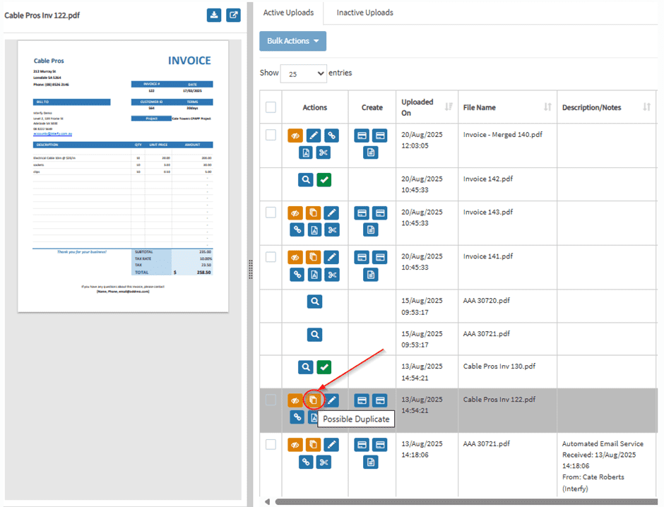 When there’s potential of duplicates, the ‘duplicate icon’ will show in the table as shown above.