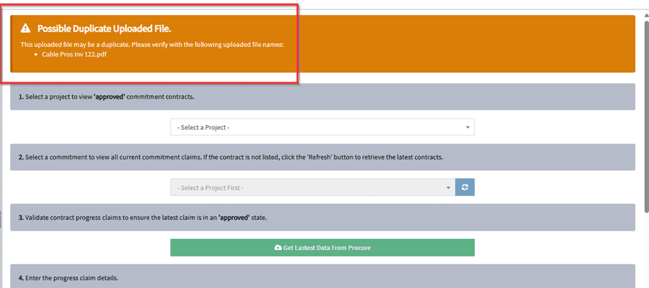 If the latest progress claim in Procore is not in an ‘approved’ state, a warning banner will show.