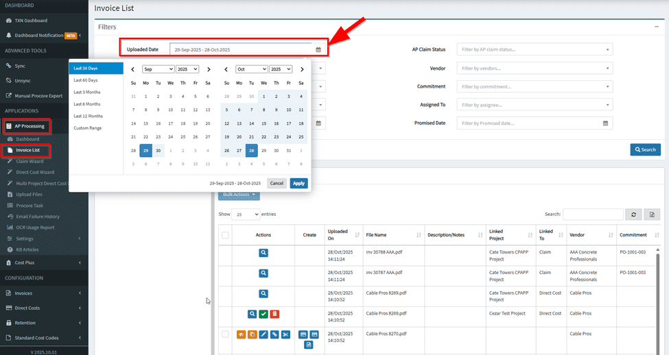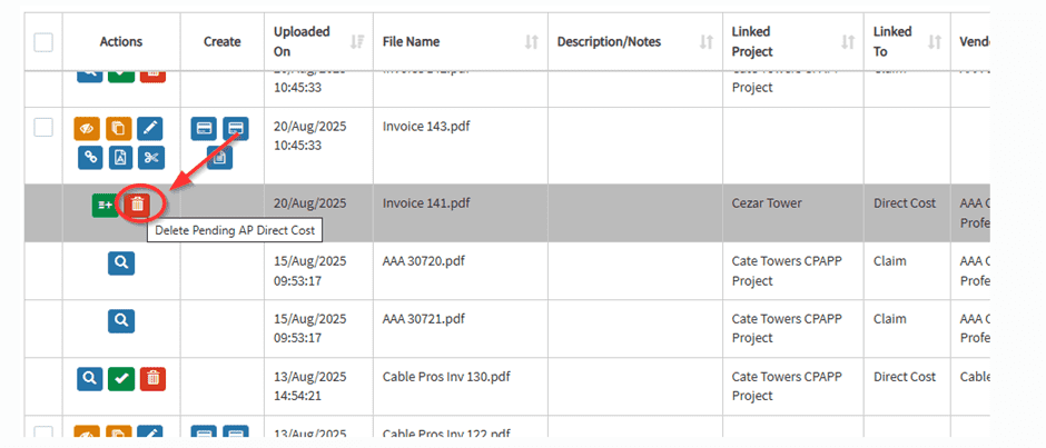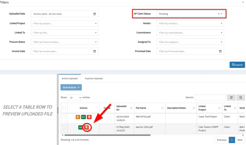 This feature allows users to delete claims with a pending AP status by clicking the red trash button to ensure invoice list remains accurate and up-to-date