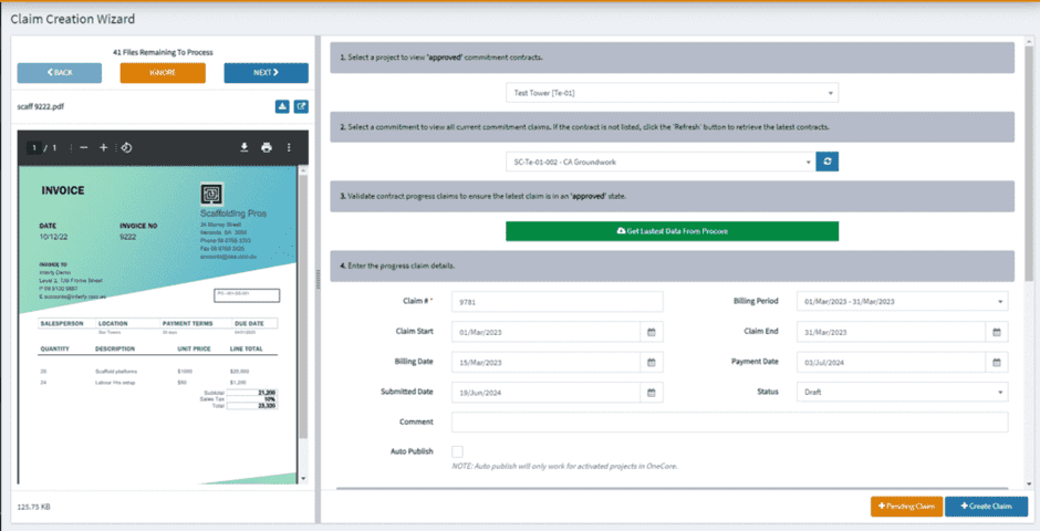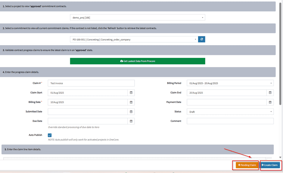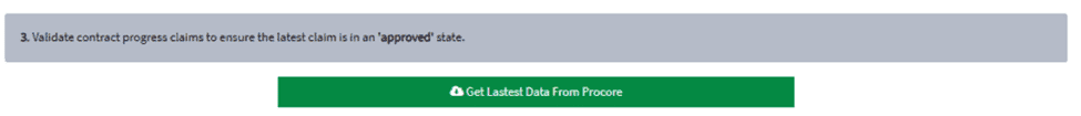 Press the ‘Get Latest Data From Procore’ button to retrieve all claims from Procore. This is required to ensure the latest claim is in ‘approved’ state.