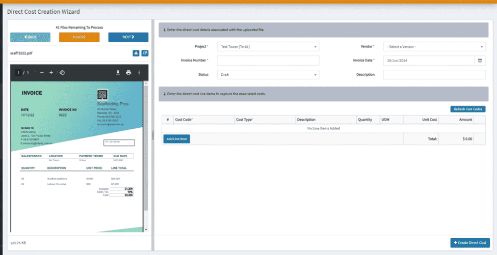 To a direct cost based on a attachment, just fill in the details into the fields, hit Create Direct Cost