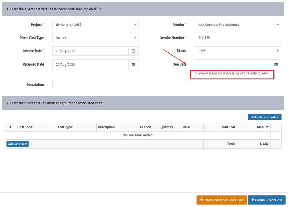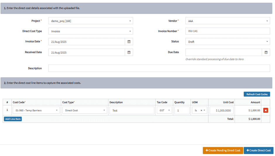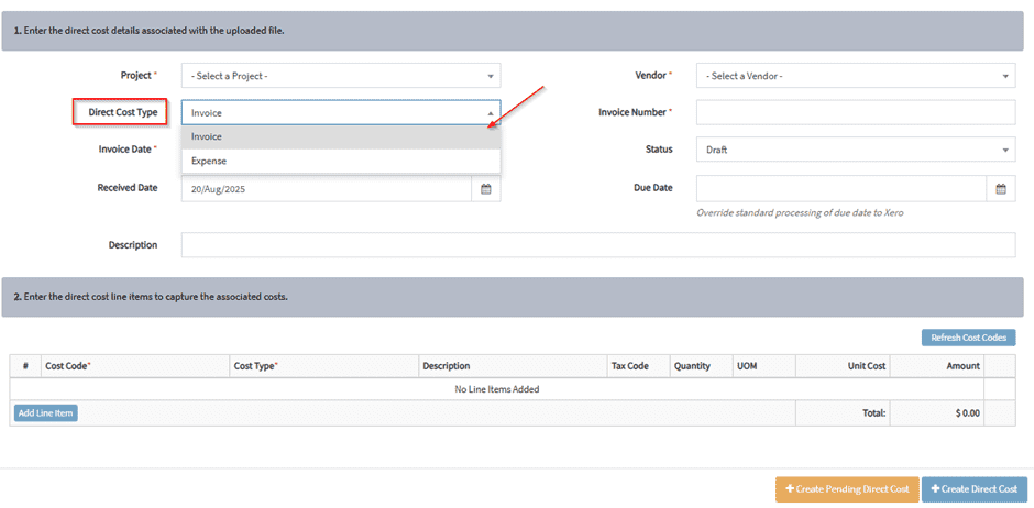 Create pending direct costs – will not publish to Procore yet and will be marked as pending in your APP dashboard.