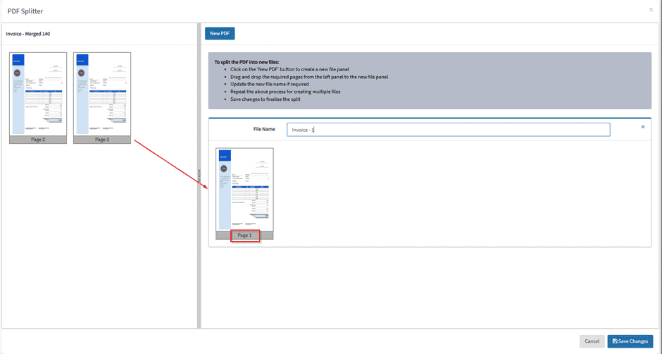 Drag 1 or more pages to the right panel to split invoice.