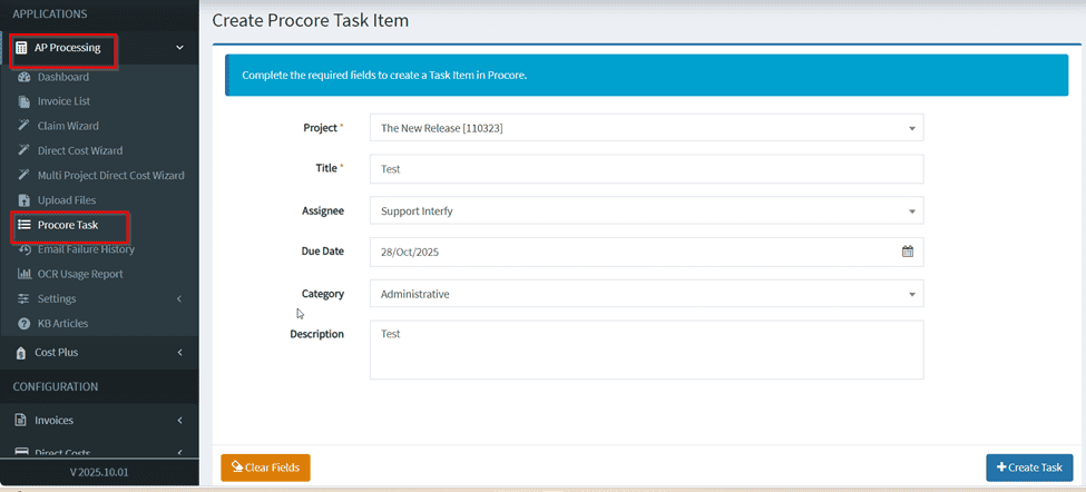 To enable Task item creation within Procore, ensure the ‘Enable Task Item Creation’ is checked. Enabling this will allow AP Processing to create a Procore ‘Task’ when a draft Commitment Claim is published from APP.