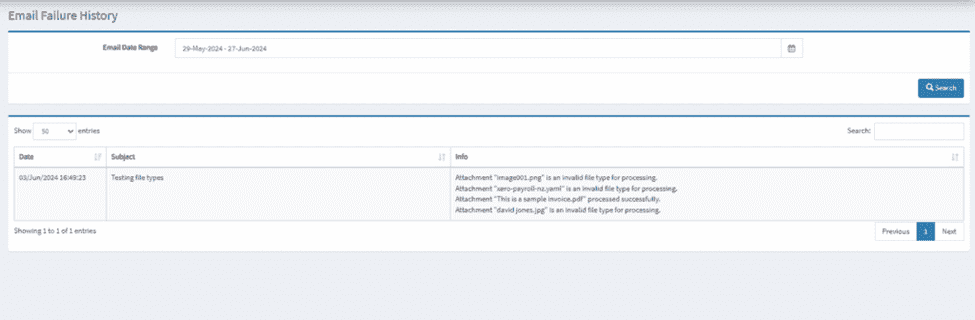 The email failure history log allows users to monitor and review any issues that occurred during the forwarding of attachments from the designated domain to the portal.