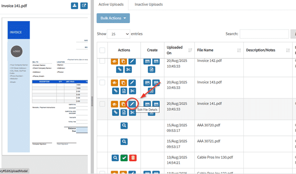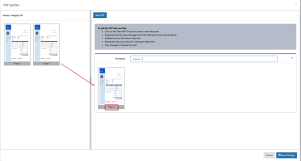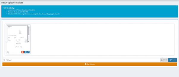 Left Panel – A preview of the uploaded invoice appears in the left panel with controls to enable the user to navigate through all uploaded invoices and to ignore any unwanted uploaded invoices.