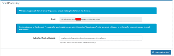 Authorised Email Address(es): Emails redirected to the above AP Processing forwarding address can retain the original “To Addresses”, enter any email addresses to authorise for automatic upload of email attachments.