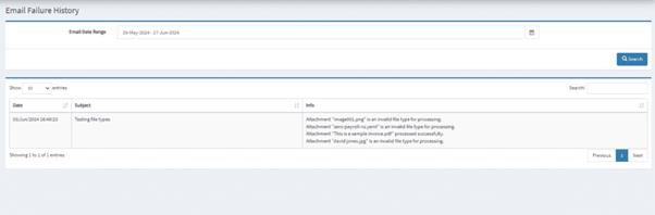The email failure history log allows users to monitor and review any issues that occurred during the forwarding of attachments from the designated domain to the portal.
