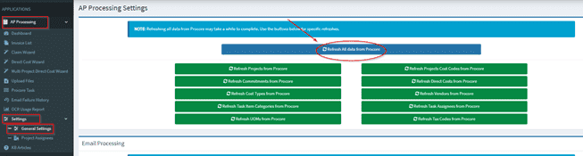 Navigate to “Settings -> General Settings” and press “Refresh all data from Procore”. This allows a OneCore to retrieve the initial information.