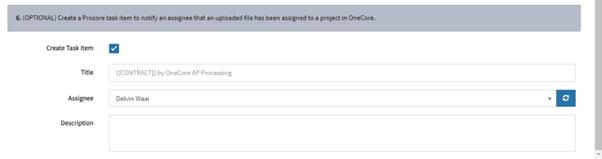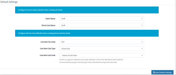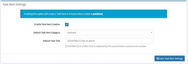 To enable Task item creation within Procore, ensure the ‘Enable Task Item Creation’ is checked. Enabling this will allow AP Processing to create a Procore ‘Task’ when a draft Commitment Claim is published from APP.