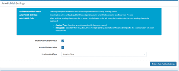 - Auto Publish On Delete – Enabling this option will auto publish the next pending claim when the latest claim is deleted from Procore