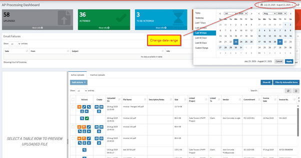 Top Banner – The APP Dashboard, by default, will show items from the last 30 days. This can be customised to display a specific date range. The coloured banners indicate invoices that fall into thresholds configured in the settings above.