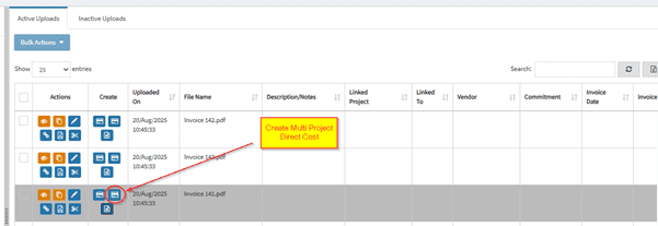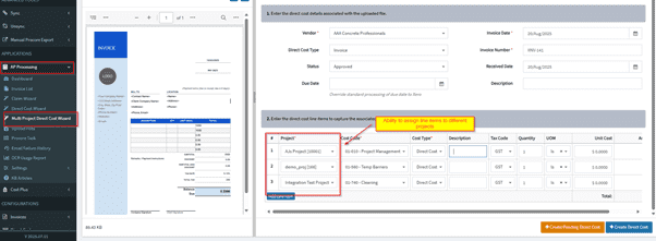 Navigate to AP Processing Dashboard or Invoice List. An additional action button is available to create a direct cost and assign to multiple projects.