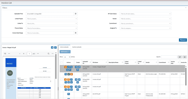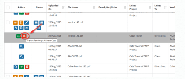 This feature allows users to delete claims or direct costs with a pending AP status by clicking the red trash button to ensure invoice list remains accurate and up-to-date