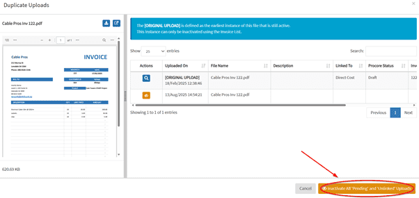 Click Inactivate All ‘Pending’ and ‘Unlinked’ Uploads to deactivate the attachments