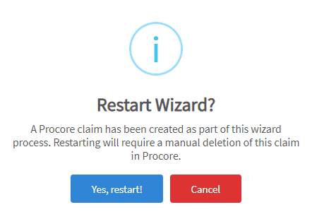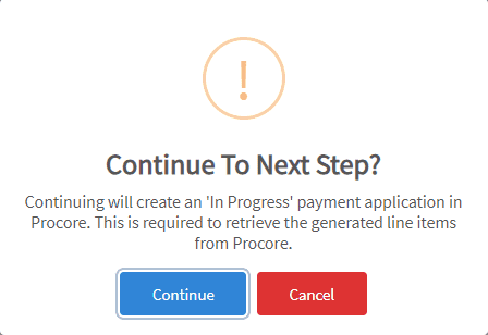 6. Once the “Next” button is pressed, a confirmation popup will appear. Once “Continue” is pressed, a Head Contract Claim will be created in Procore with the description “[CP IN PROGRESS]”