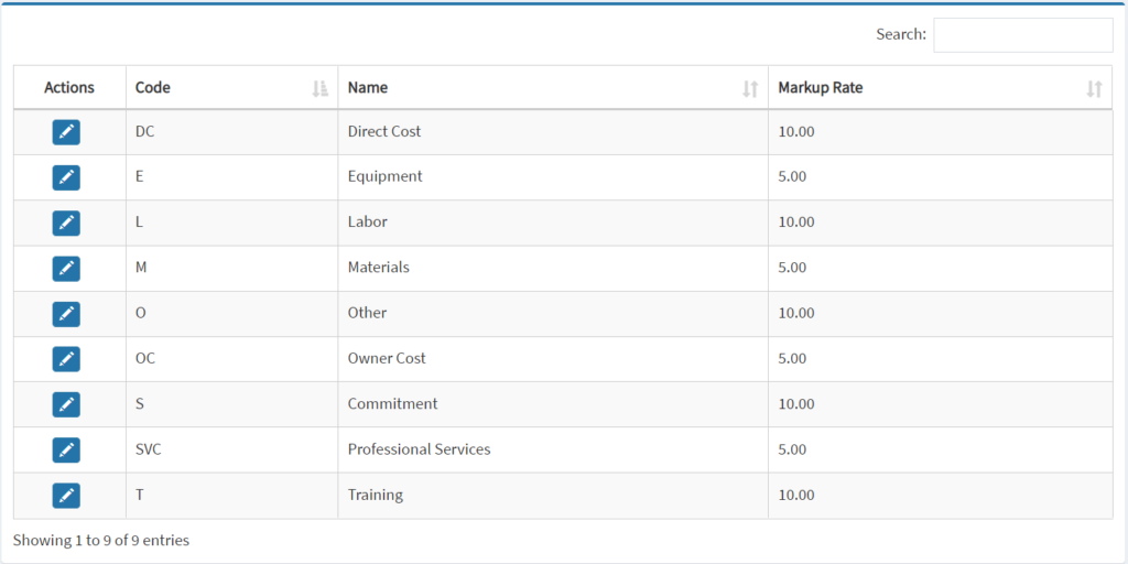 If a project does not have custom markup rates entered, the default markup rates (above) are used.