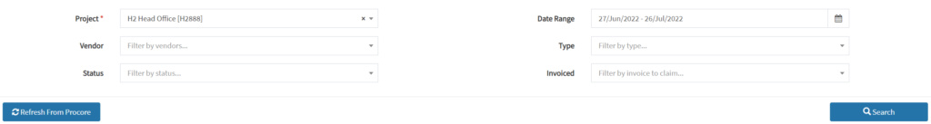 - If a commitment claim can’t be found in the table, ensure the date fields are within the desired range and press “Refresh from Procore”.