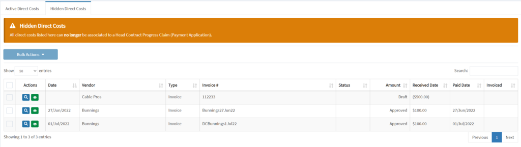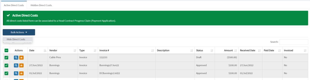 - Select “Bulk Actions” then “Hide Direct Costs / Commitment Claims”.