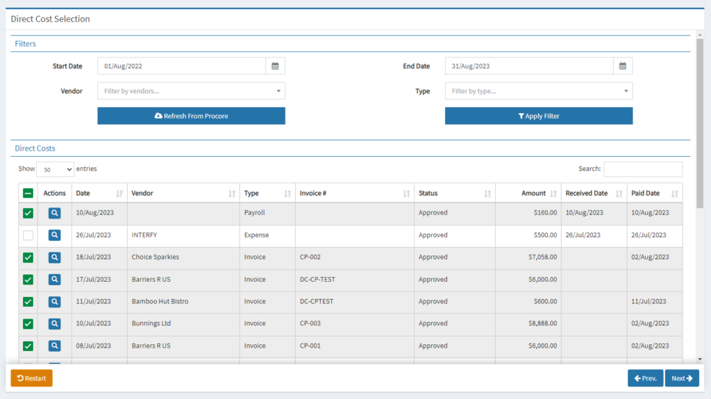 - Finding a direct cost is made easier by utilising the “Vendor” and “Cost Type” filters if there are a large number of direct costs for the period.