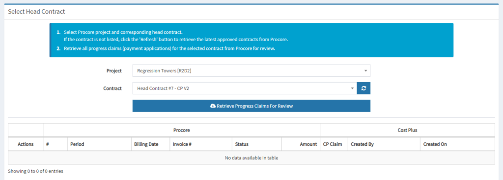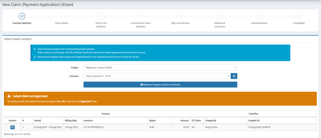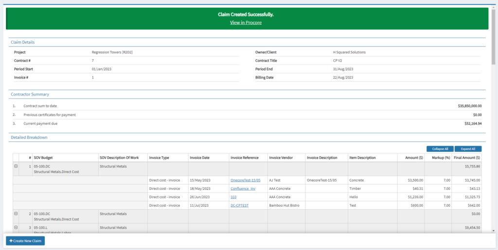- Existing claims related to the contract will be retrieved from Procore and displayed.
