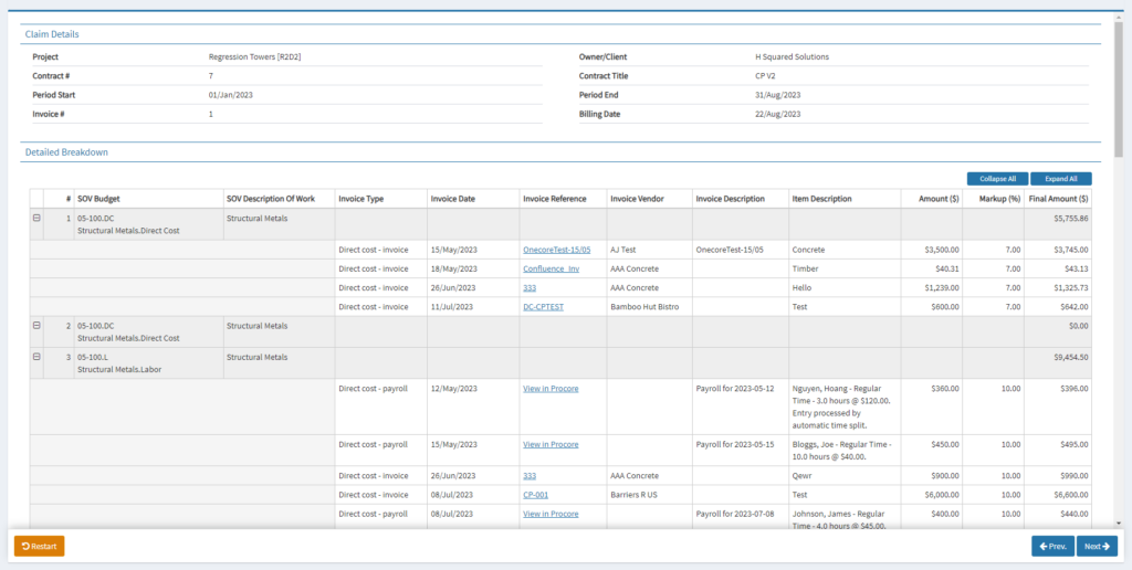 - To view a Direct Cost or Commitment claim within Procore, click the link provided on each line item.