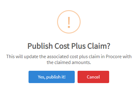 4. Once the “Next” button is pressed, a confirmation popup will appear. Once “Yes, publish it!” is pressed, the Head Contract Claim previously created in in Step 5 will be updated with “Work Completed” values entered and the prefix “[CP IN PROGRESS]” removed.