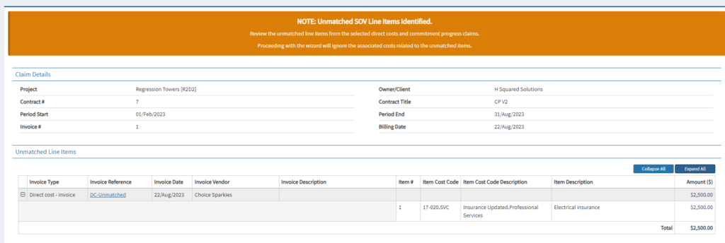 3. Update the Head Contract SOV with the missing budget code and restart the claim wizard.