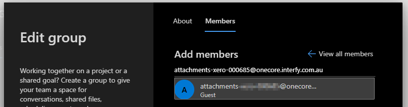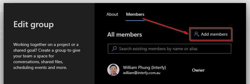 Click on the Members tab and then Add Members button to add the APP mailbox we have provided you with. Adding this mailbox as a member will have all emails sent to your Group mailbox be forwarded on to any group member mailbox.
