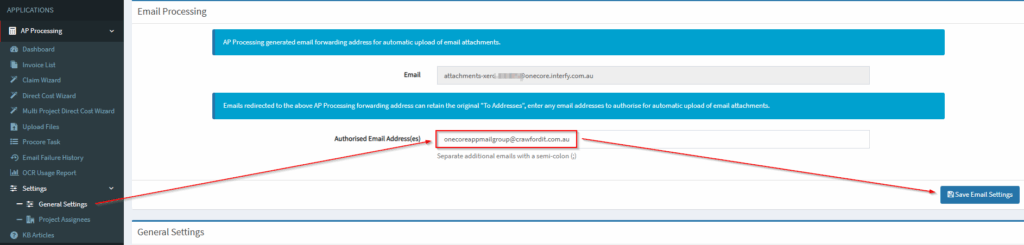 Once the mailbox has been added go to your OneCore to and navigate to AP Processing>Settings>General Settings. You will need to add the group mailbox you created to the Authorised Email Adress(es) area and remember to save your settings once done: