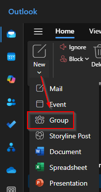 In your Outlook under New on the top left corner, select the down arrow to bring up the menu. Select ‘Group’ from the menu: