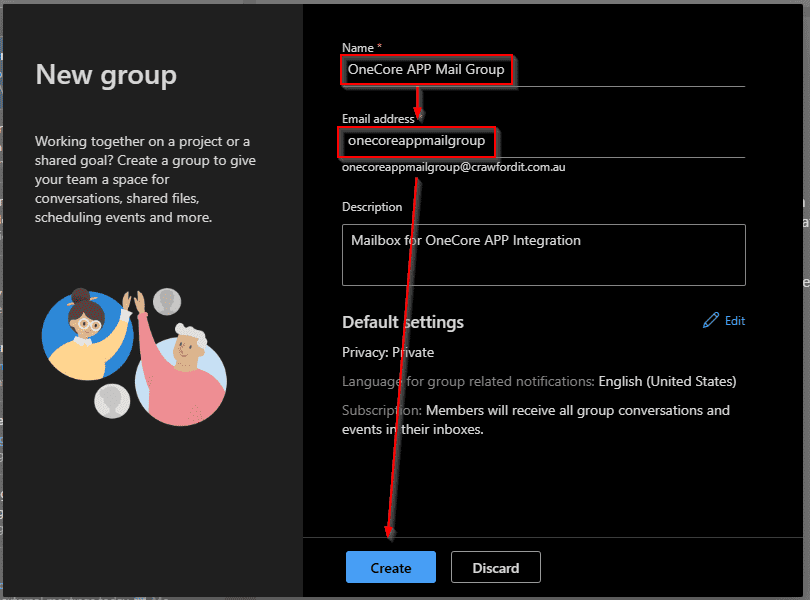 Name the new group appropriately. I have named it OneCore APP Mail Group. You will then need to choose the name of the mailbox. In this case I have setup with the default email address. Once done, hit the Create button.