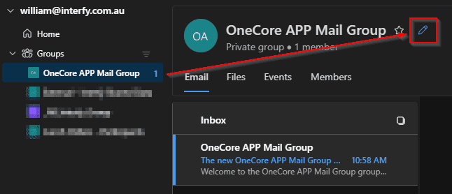 Once created you will see the new Mail Group populate in your Outlook under the Groups menu. Select the Edit option.