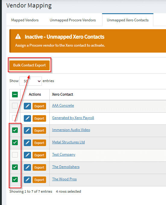 7. You can also export your unmapped Xero contacts in bulk by checking the tick box alongside each of your unmapped Xero contacts and then selecting the orange Bulk Contact Export button.