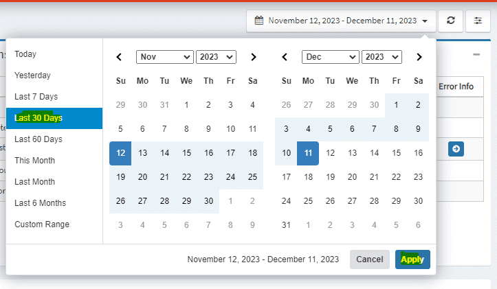 2. Select the date range to filter by. Click on Apply i.e. last month.
