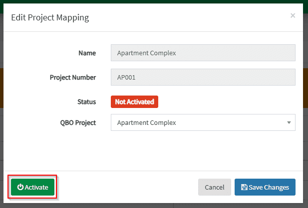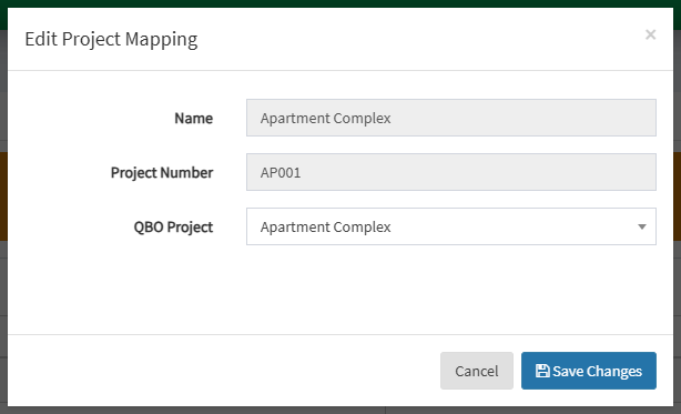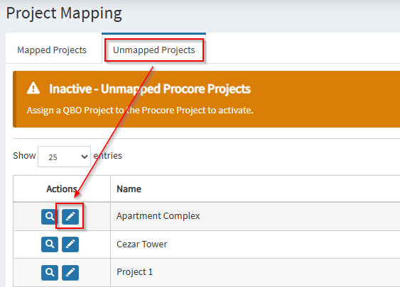 4. Go back to Project Mapping in OneCore and re-map the project by clicking on the pencil icon, and mapping it to the corresponding QBO project.