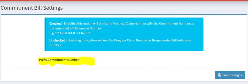 2.2 If you would like to prefix number, then check the prefix commitment number option and it will be shown as <<Type-Number-Claim Ref number- bill reference number>> E.g. PO-200814-001-Claim1-21018191828238