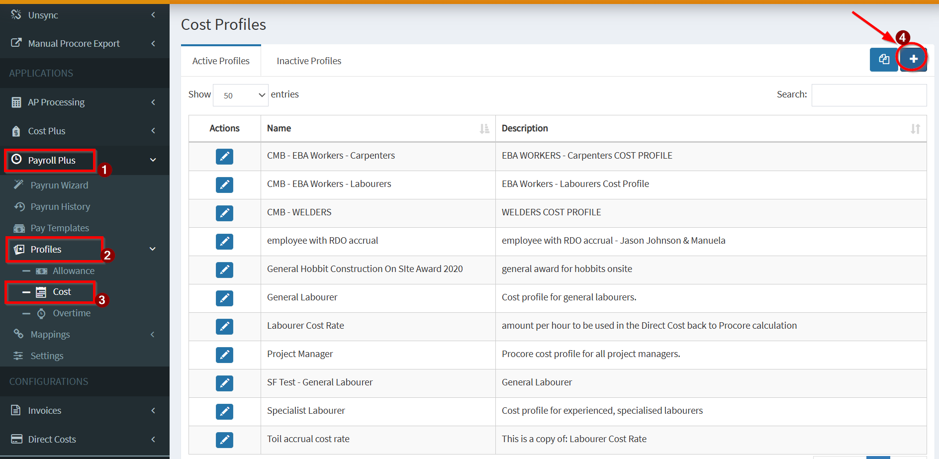 2. Navigate to Profiles > Cost > click on the + icon in the Cost Profiles table