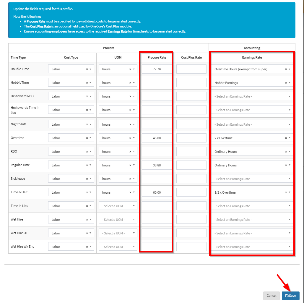 - Earnings Rate – Link the earnings rate from the accounting system to each time type in Procore
