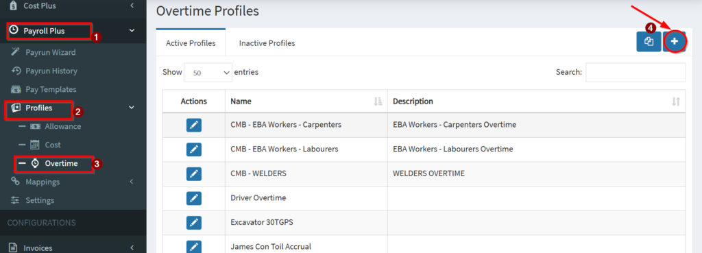 2. Navigate to Profiles > Overtime and Click on the + icon in the Overtime Profiles table