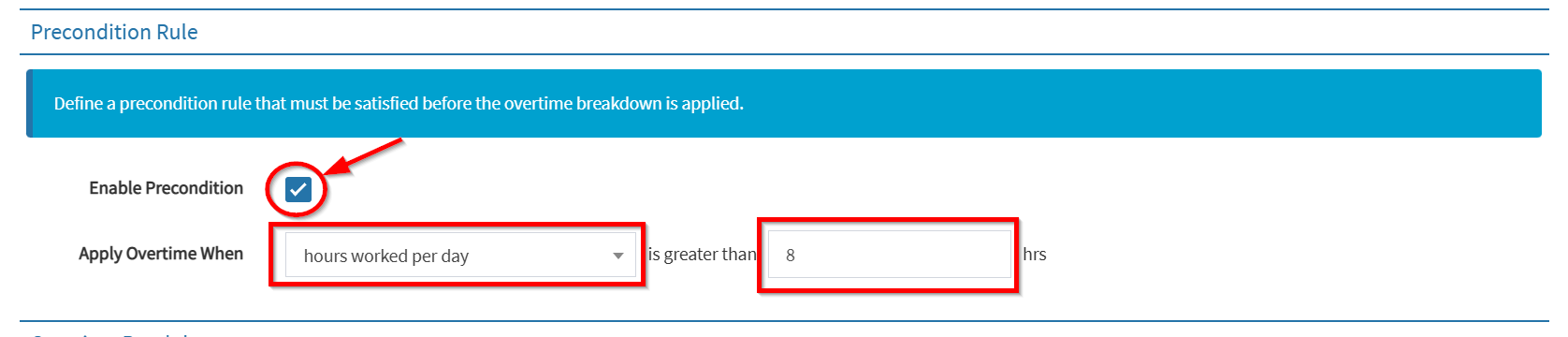 - Precondition Rules (Optional) – Define rules for applying overtime, such as when hours per day/week exceed a certain threshold.