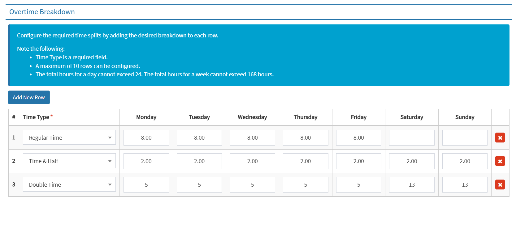 - Time Split Configuration – Configure the required time splits by adding the desired breakdown for each row. This allows users to set detailed overtime calculations based on specific conditions and breakdowns