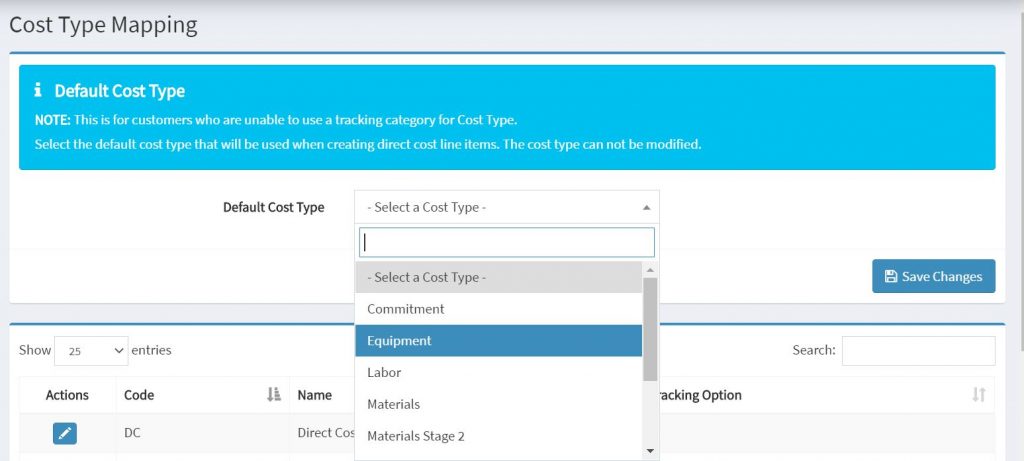 If you are unable to provide a tracking category to be used for cost type, onecore allows you to specify a default cost type. That will be used when creating a direct cost line items.