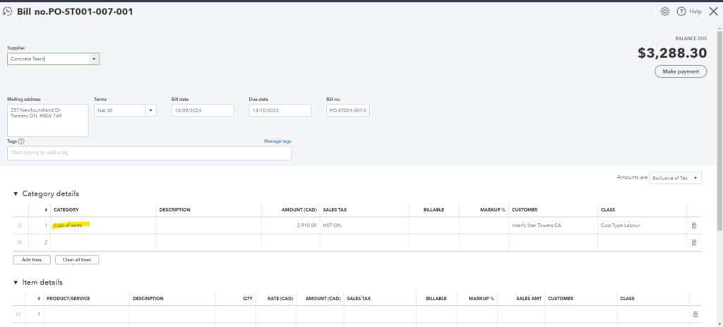 This is an example of Line Item Retention Type in QuickBooks Bill created from Commitment Claim.