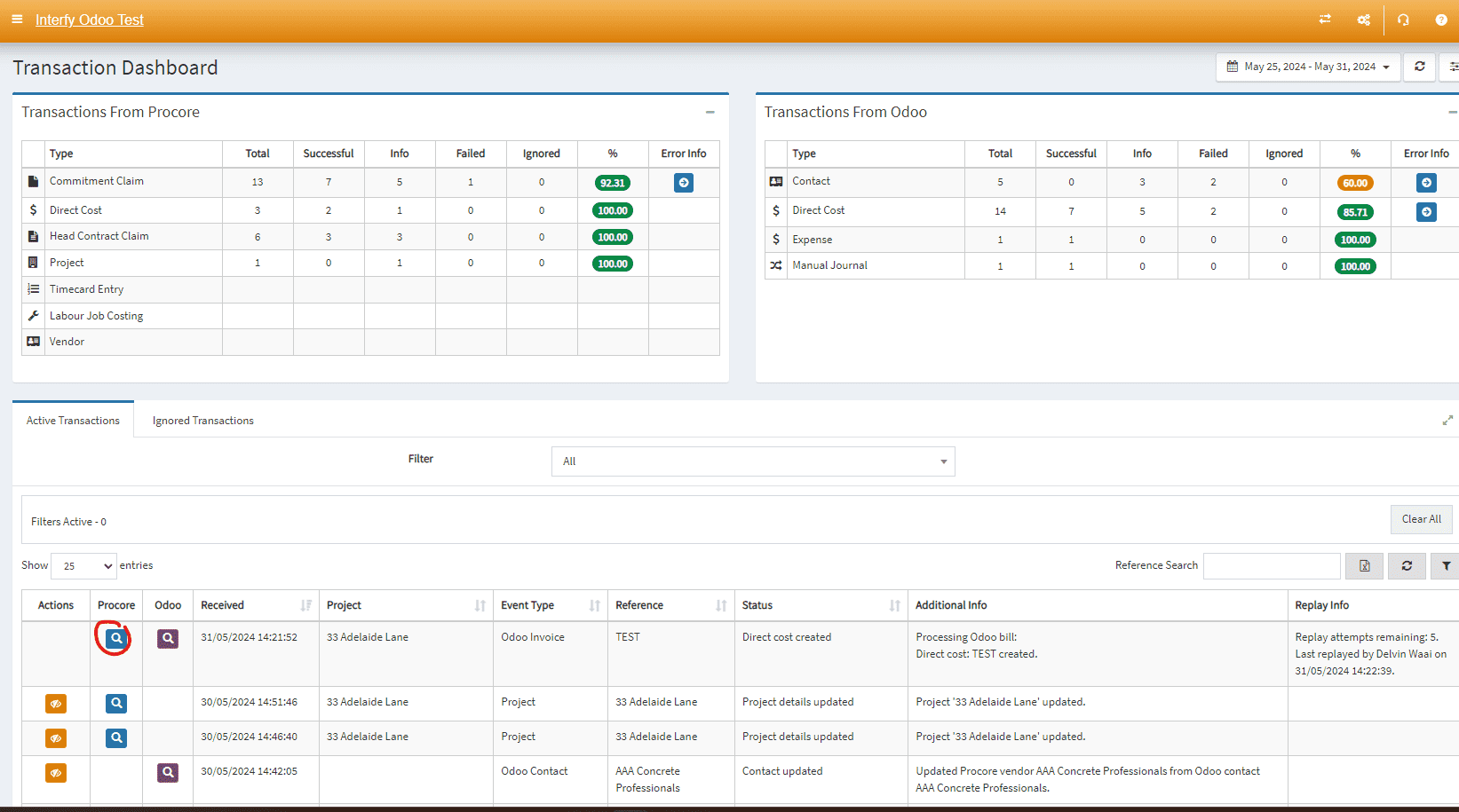 6. After 1 minute or so, navigate to OneCore Transaction Dashboard, click Search Icon in Procore column.