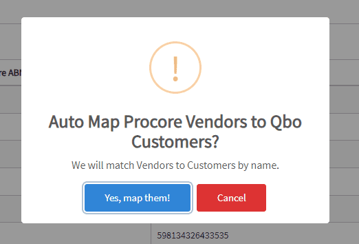 NOTE: To auto-map contacts and vendors, go to the Mapped Vendors tab and click on Auto Map Vendors by Name. This will only work if the corresponding Procore vendor or QBO Vendor has been created. Select Yes, map them! to map the vendors.