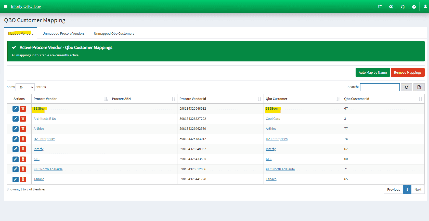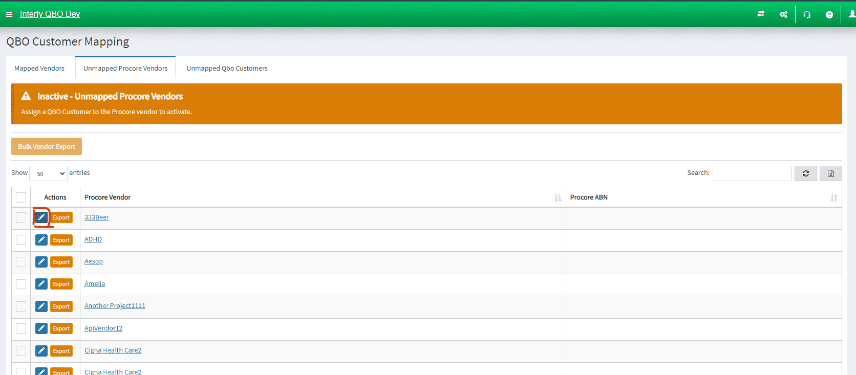 NOTE: One Procore Vendor only can be mapped to either one Quickbooks Customer or QuickBooks Vendor. That being said, if your Procore Vendor is mapped to QuickBooks Customer, it will not exist in QuickBooks Vendor mapped and unmapped table, vice versa.